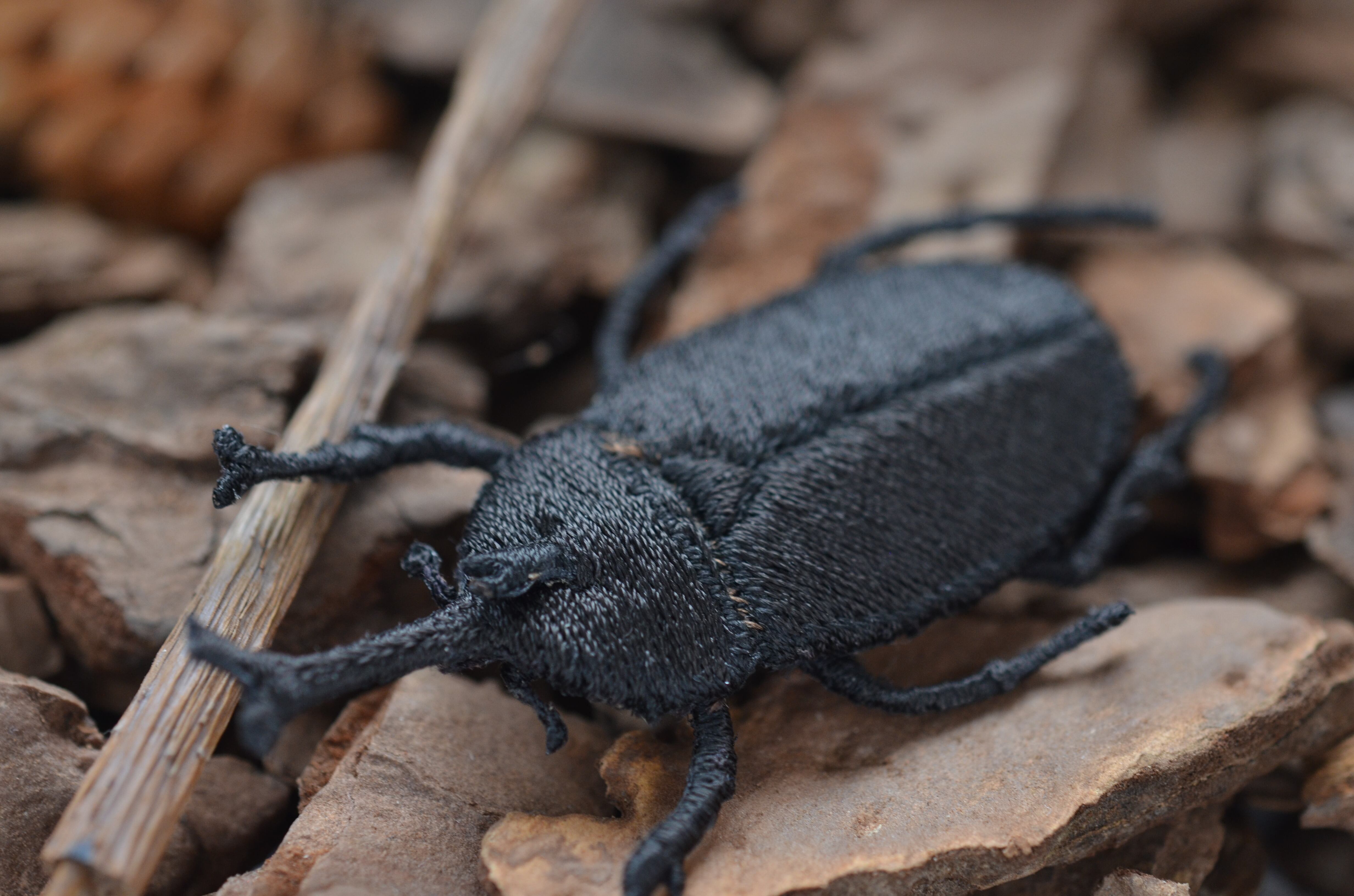 角の曲線と艶やかな黒。夏の象徴をそのまま糸で封じ込めたような存在感です。