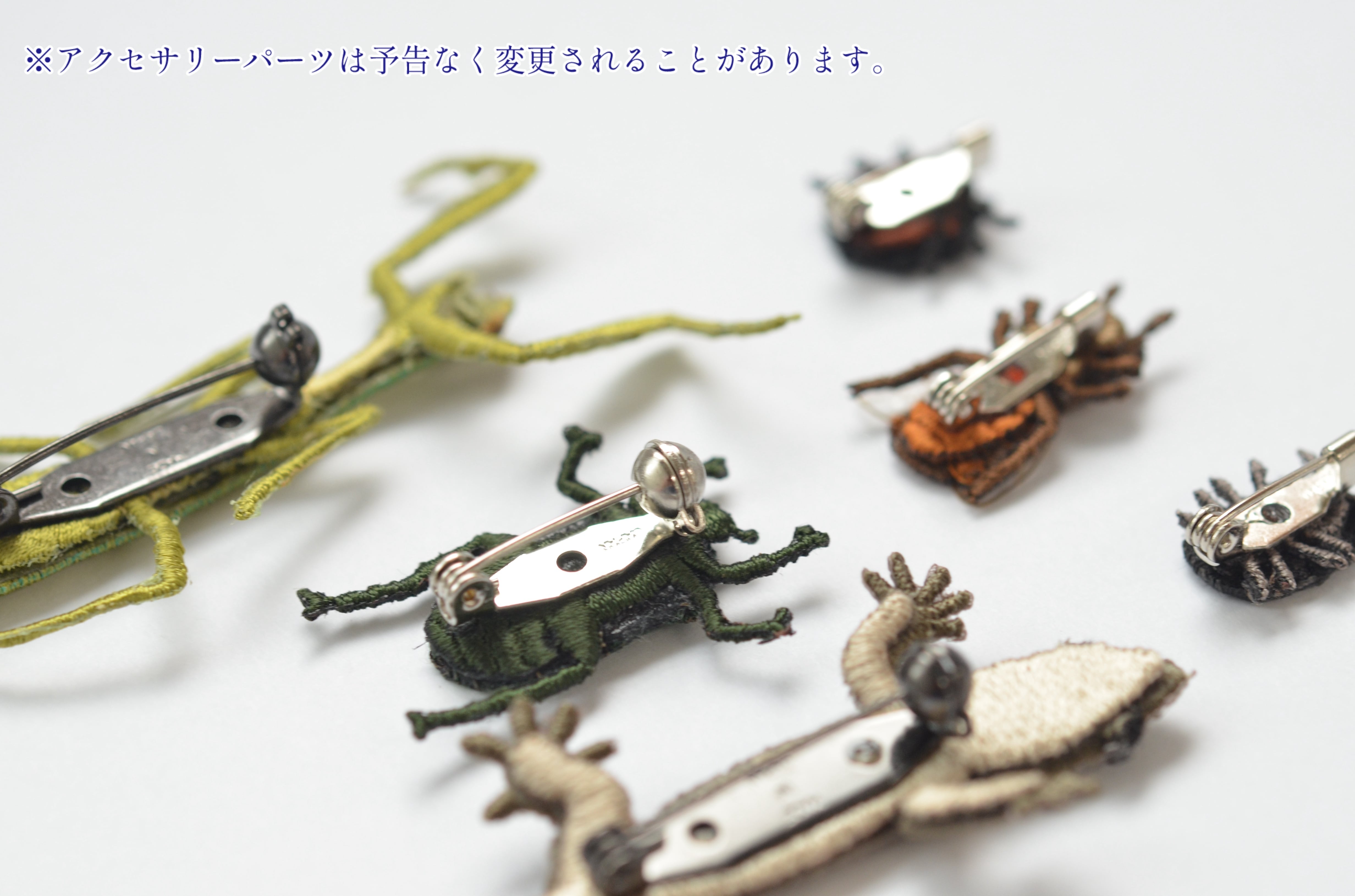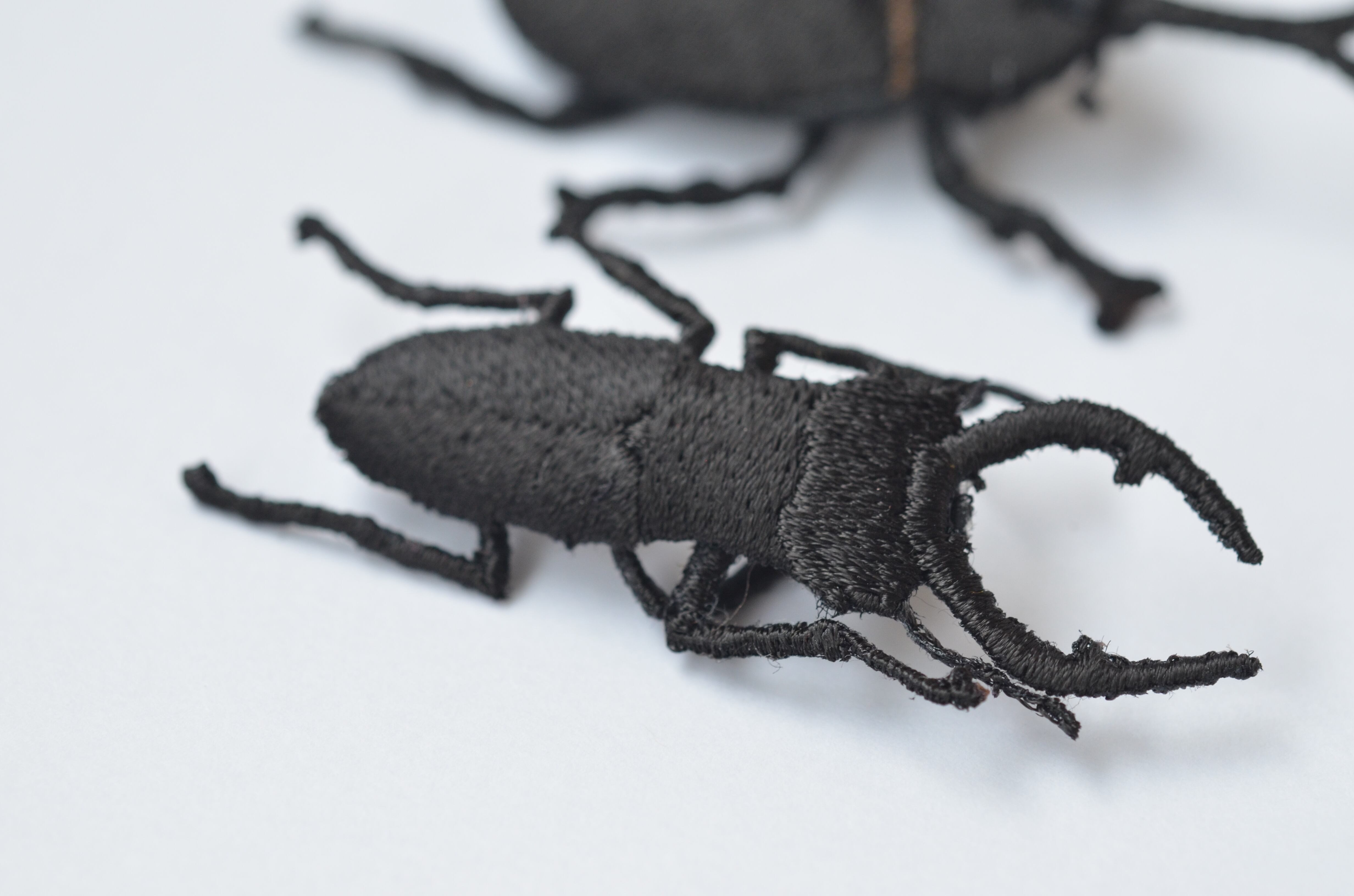 堂々としたアゴと滑らかな外殻を刺繍で再現。糸の陰影が放つ重厚感が魅力です。