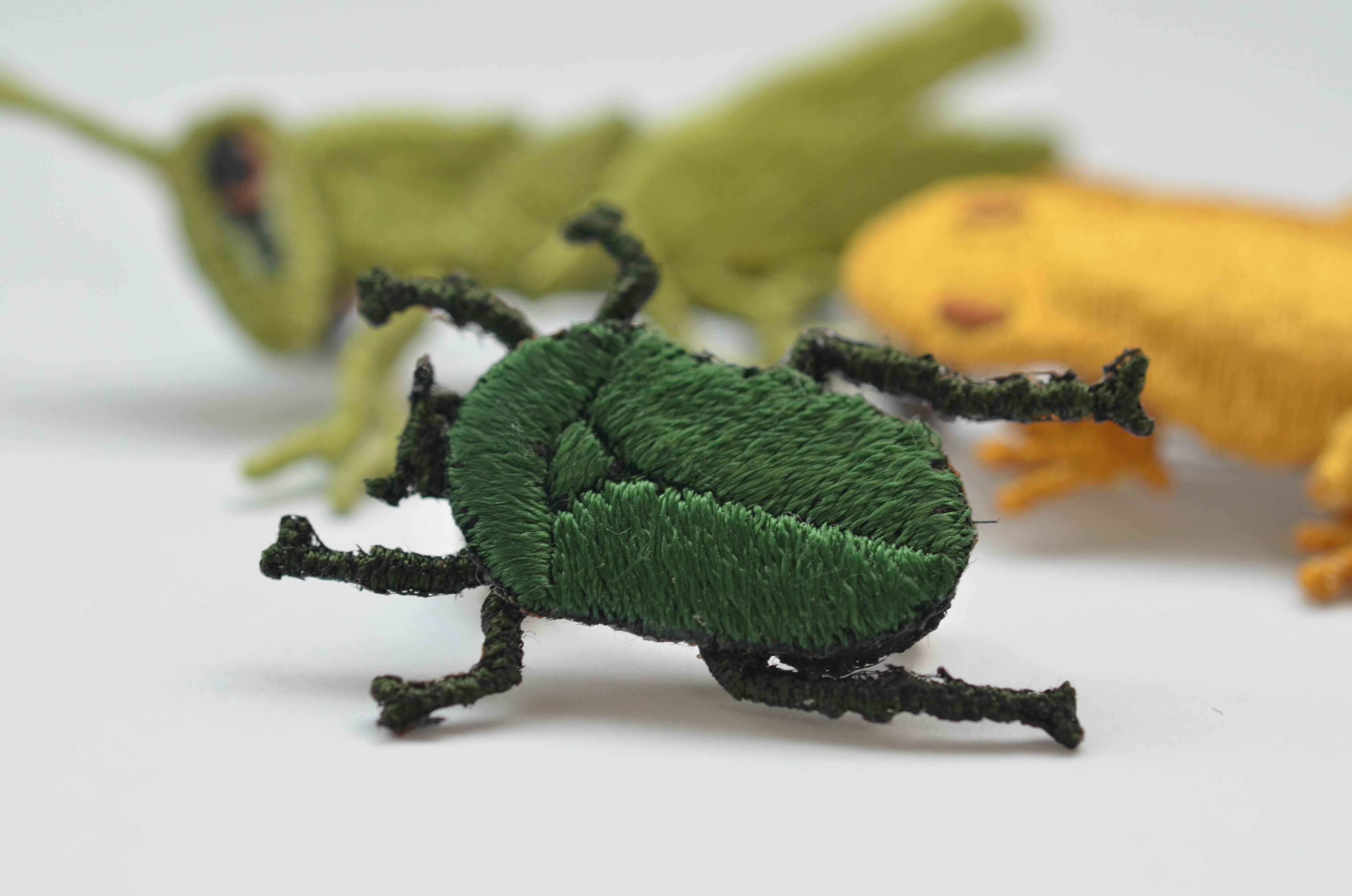 メタリックグリーンの輝きを糸で表現。光の角度で色が変わる、美しい存在。