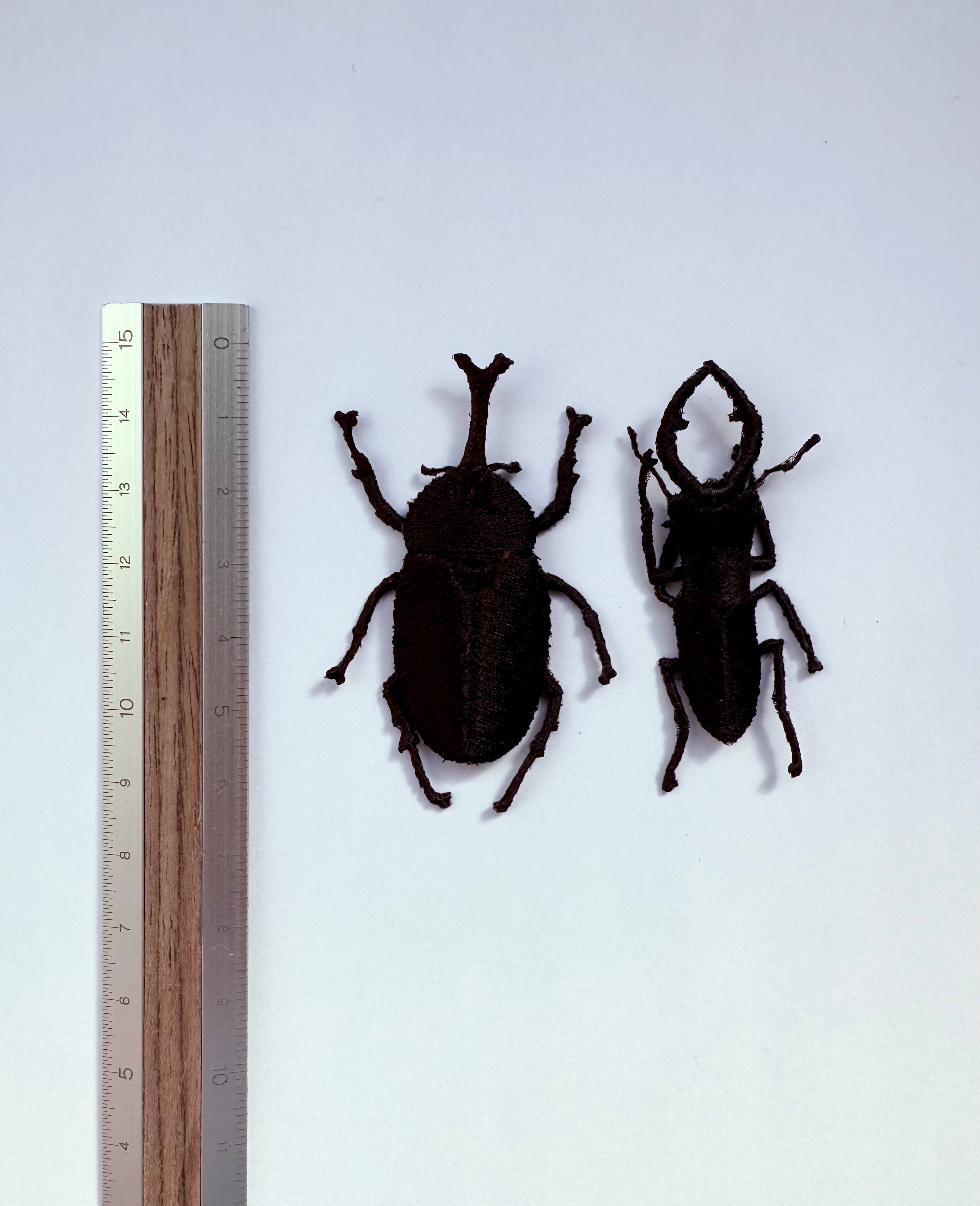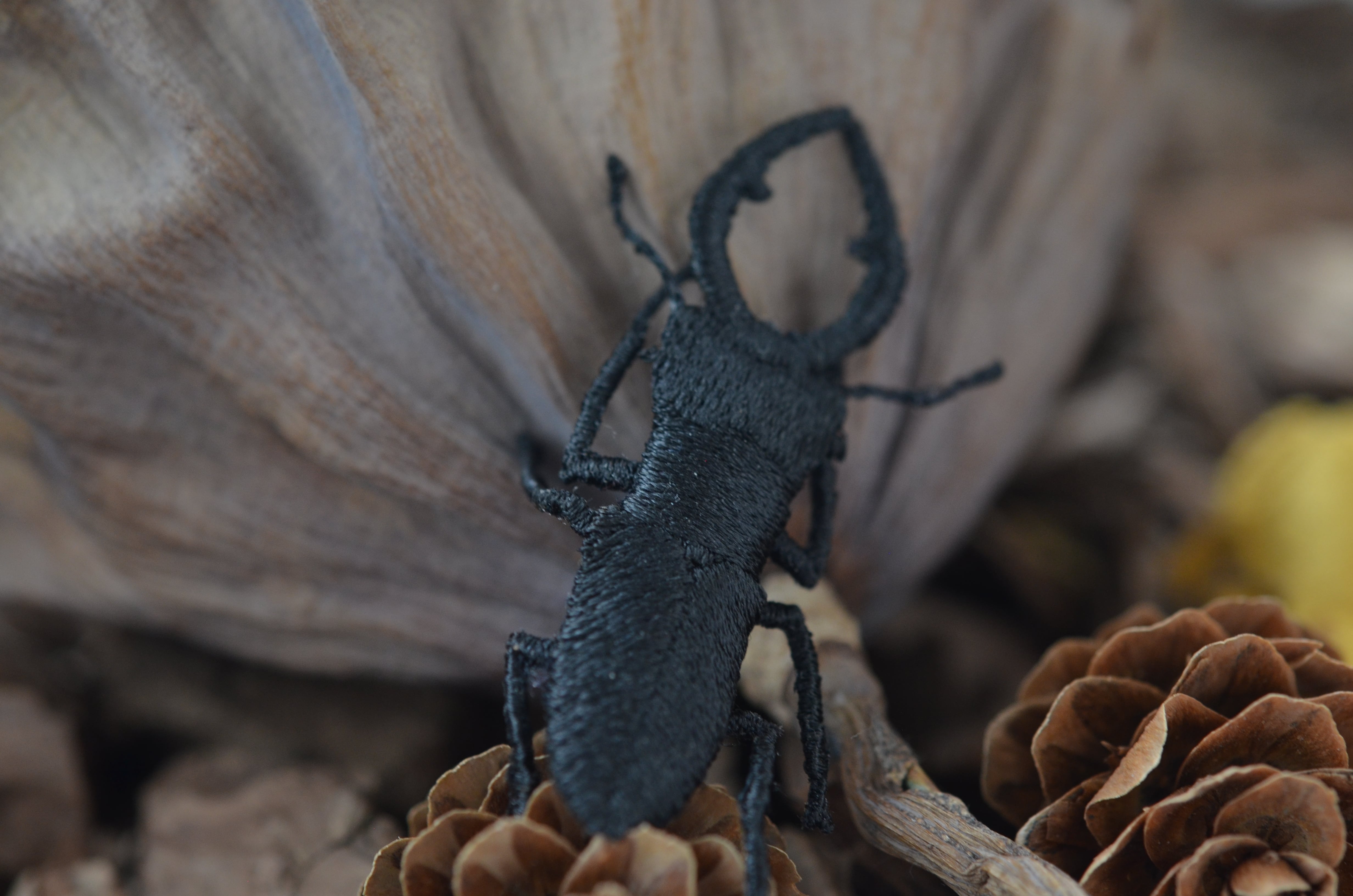 堂々としたアゴと滑らかな外殻を刺繍で再現。糸の陰影が放つ重厚感が魅力です。