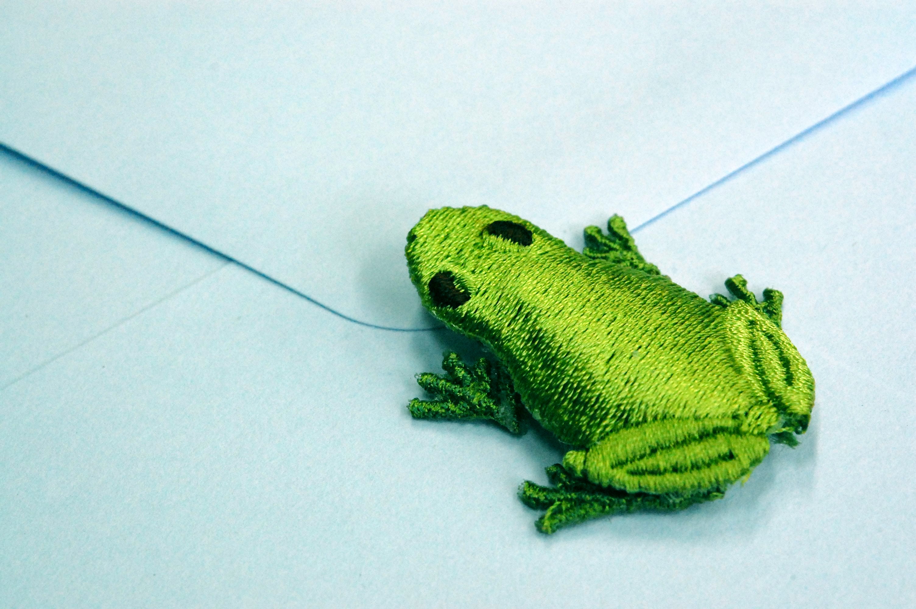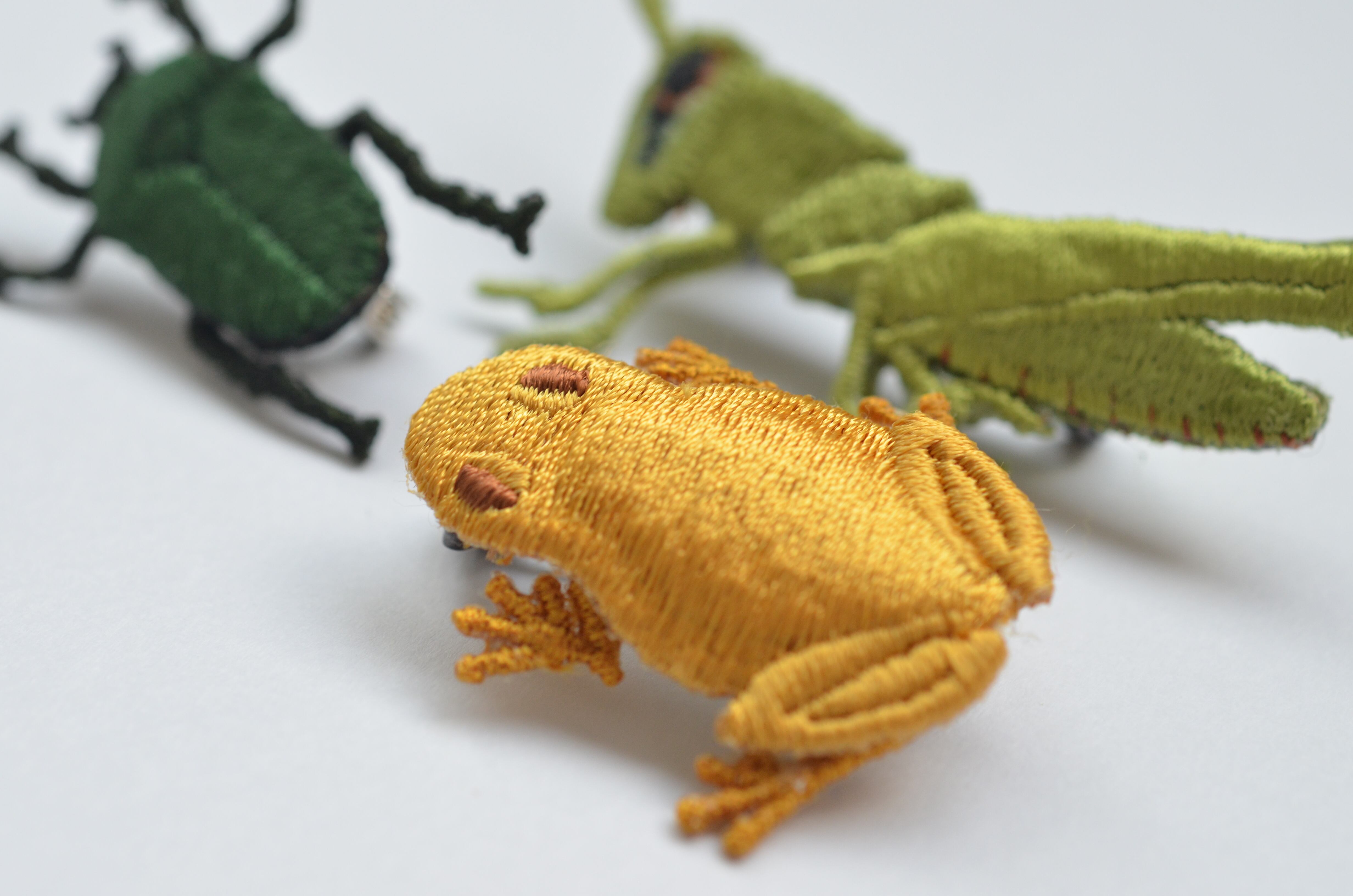 「福を呼ぶ」カエルのイメージを形にした、明るく輝く、幸運を呼ぶ小さなカエル。豊かさと再生を象徴する色を、糸の光でやわらかく表現しました。